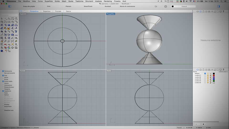 I have started to work combining samples solids. My first idea was easy: do a reading lamp whit the combination of 3 solids: 2 cones, 1 mirrored to the other one, with a sphere inside.