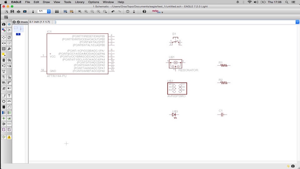The schematic editor is used for designing circuit diagrams. Parts can be placed on many sheets and connected together through ports.