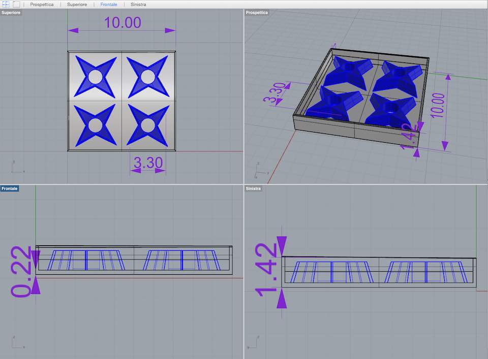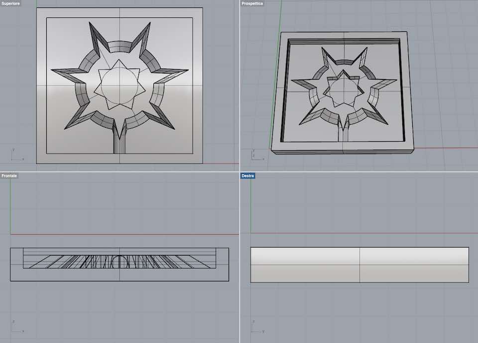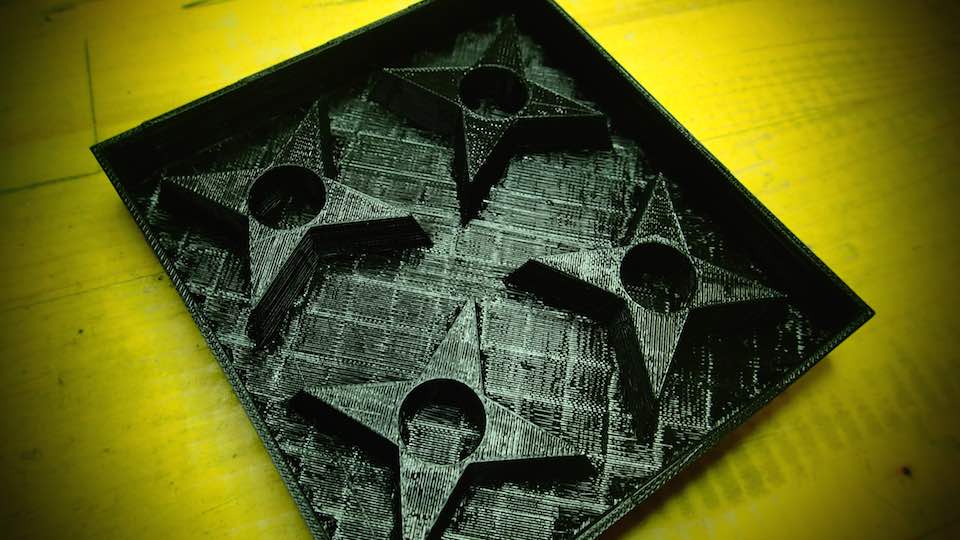 With Ryno I created a simple empty box. Inside I modeled a simple ninja star. Then I mirrored it to produce 4 models and exported the stl file.