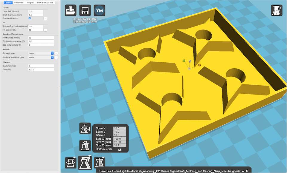 After appropriate scaling I then proceeded to create the G Code using Cura.