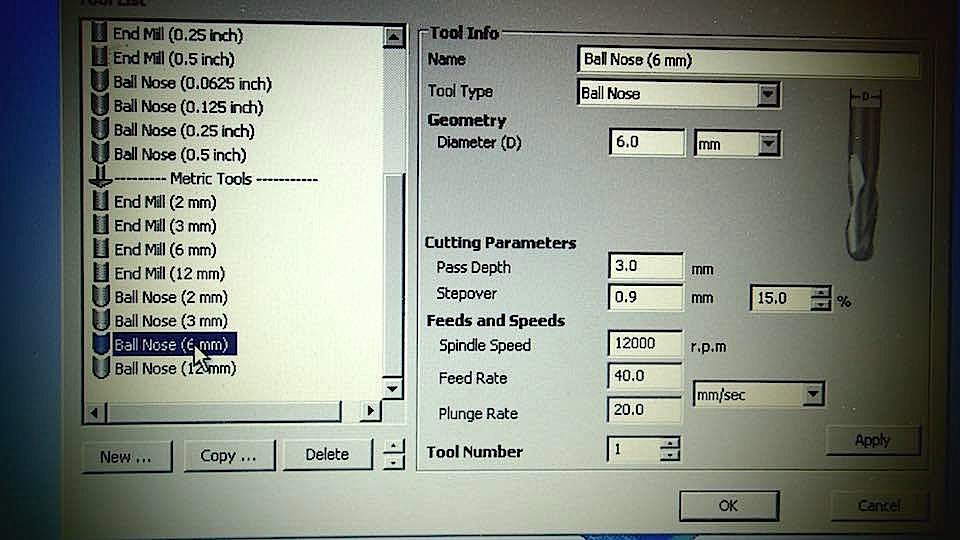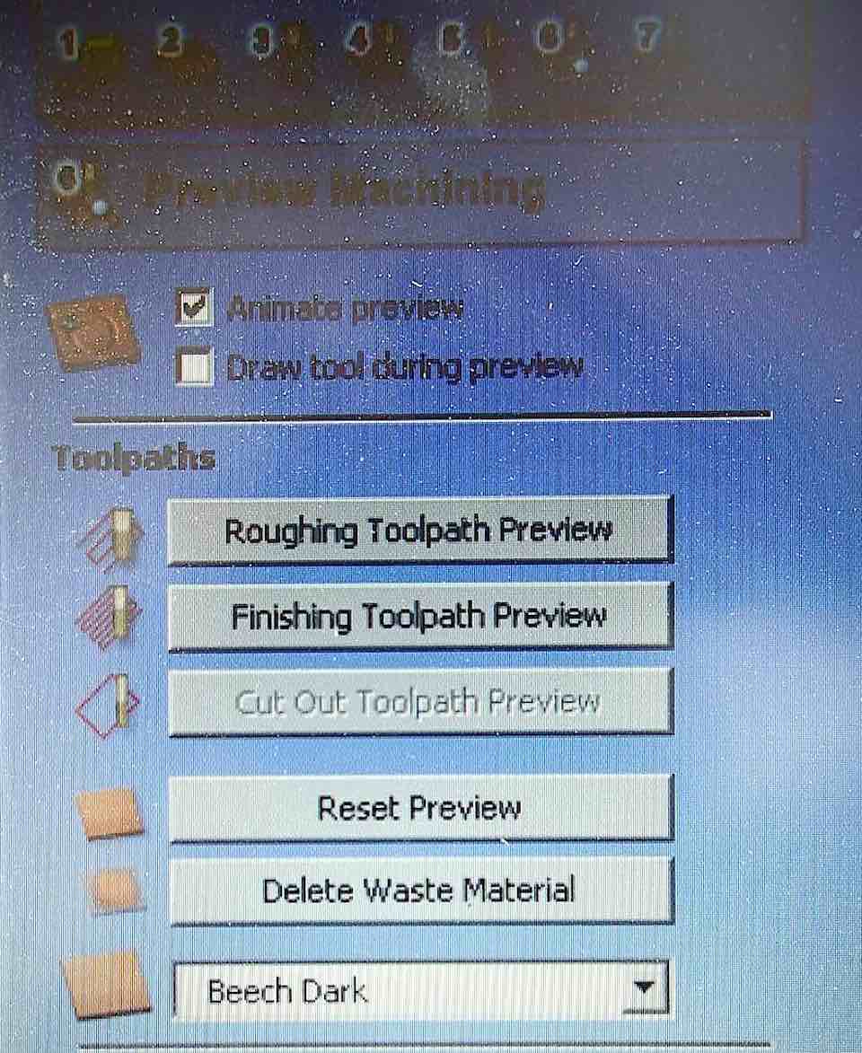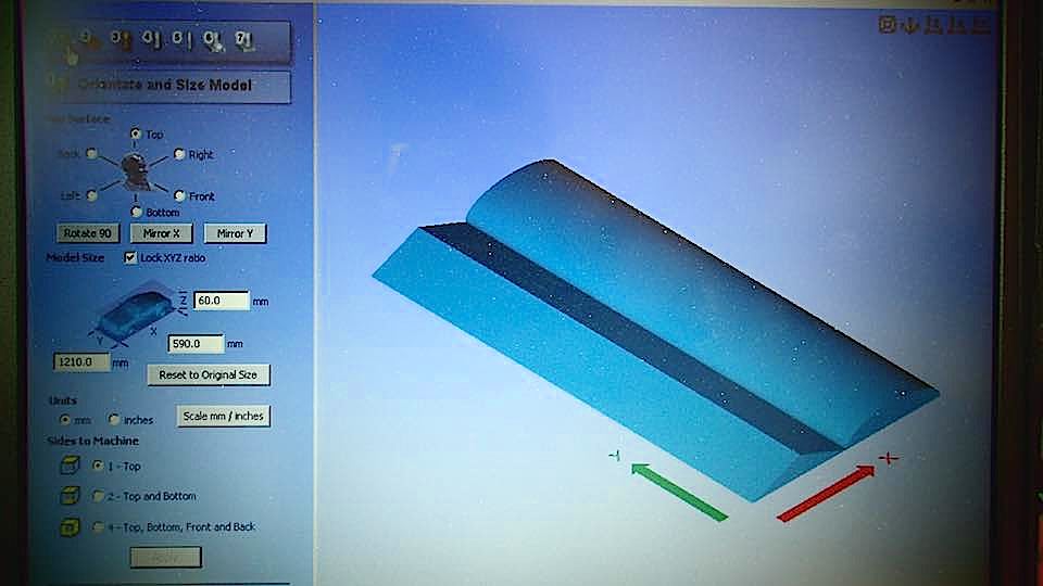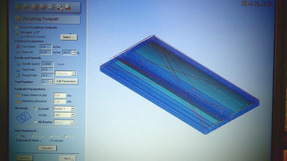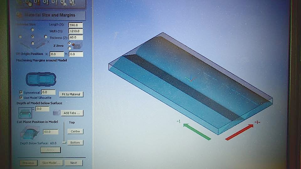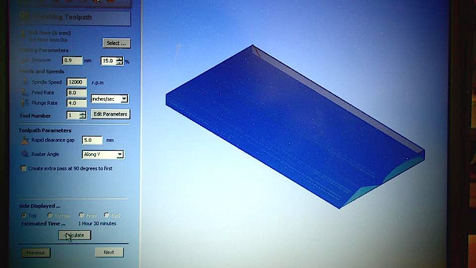 Then fix the polyuretane block in the work table of a CNC machine, with screws and hot glue, set the parameters of Partworks 3D.