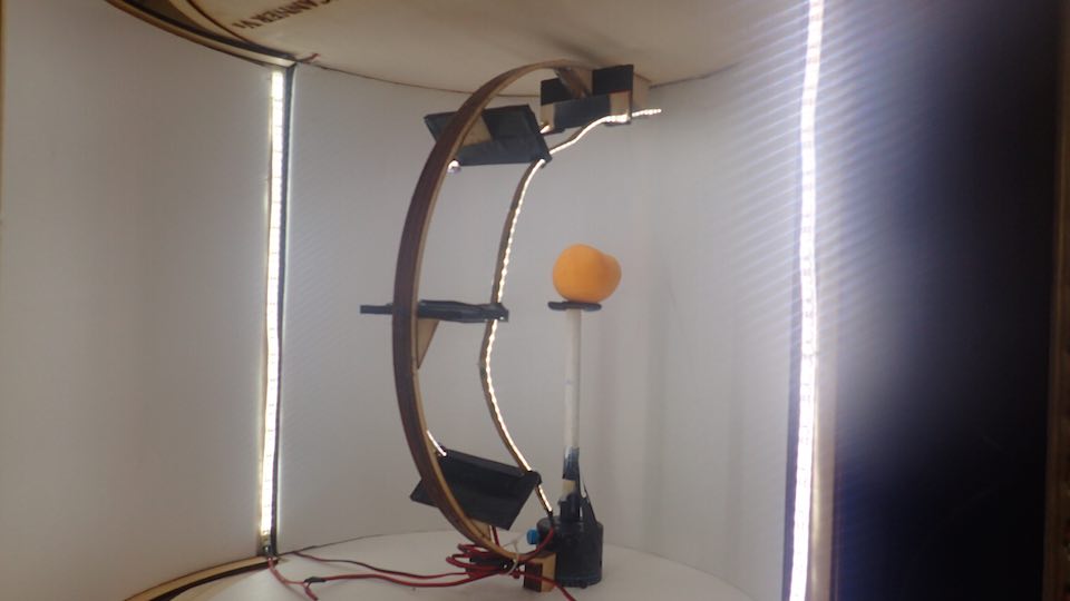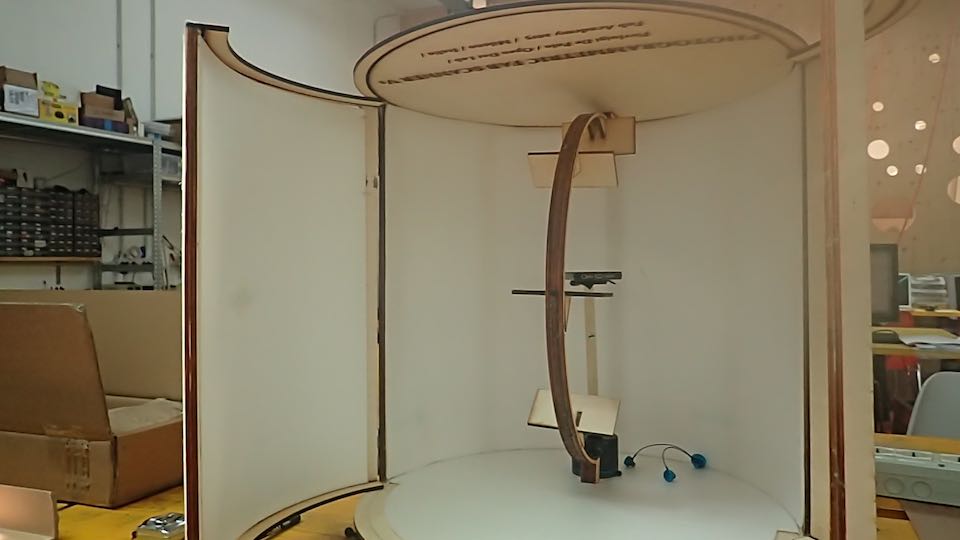 V0.3 // INANIMATE VERSION : structural prototype , illuminated, fitted with supports for the simulation of the machine movements and with a Rotator Graduated Head to simulate the precise rotation of the object to the scanned.