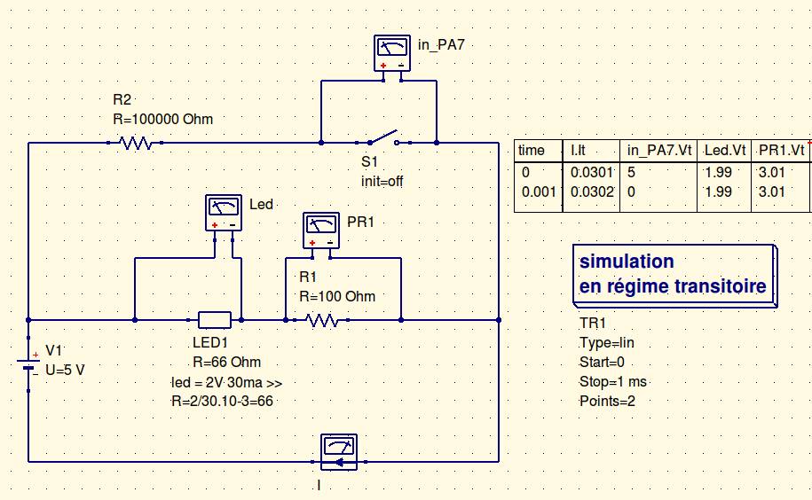 As there was no led in the library (as diodes and I could not find my settings led), I simulated one with a resistor (the time scale on which I'm studying the diagram, it makes no difference).