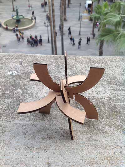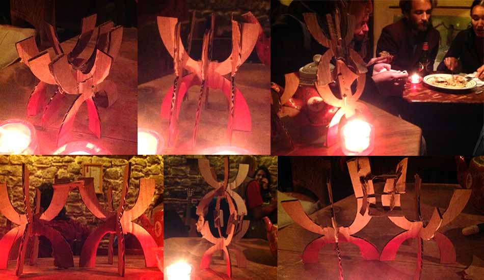 This testing session was crucial to the development of the lattice structure. I borrowed a knife from the bar and started manually cutting out joints which could unite the pieces. I also figured out the inner straight line was not necessary and I could remove it. During the evening many people asked, what I was doing. One musician -she´s a drummer- told me that the shapes reminded her of a ceremonial drum from the Mapuche Tribe in Chile called the Kultrun (a type of tambor).