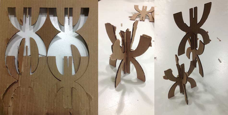 Next stage was assembly... I had forgotten to insert the middle joint in the modular pieces. As it was the weekend and I couldn´t get into the lab again, I handcut the cardboard pieces. This gave me the opportunity to experiment with one, two or three jointed modular pieces.