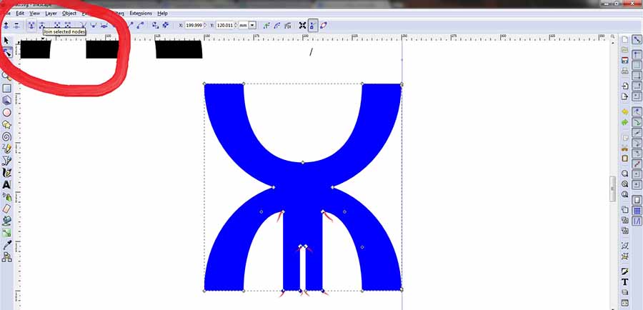 First a great revision of vector program, Inkspace (open source and amazing tool). Machines need to work in vectors; vectors instruct the path of creation. I used the circle tool to create half and quarter moons and the rectangle tool for the slits. I then selected the objects and selected the path difference to cut out the the negative spaces.