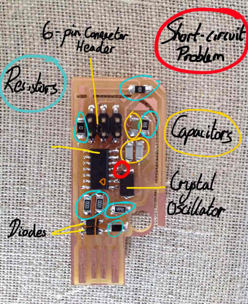 After soldering the board, I encountered a short circuit problem between my micro controller and crystal oscillator. So I used a small knife to pick off the solder that caused the problem.