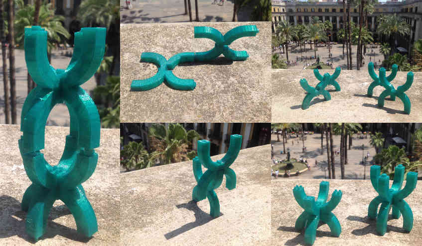 I used the makerbot to print out the pieces in green PLA. My first iteration had many holes and cyclinders (alike to lego), making it hard for them to fit into each other. I redesigned the piece to have just one hole and cylinder for each joint, for better fitting.