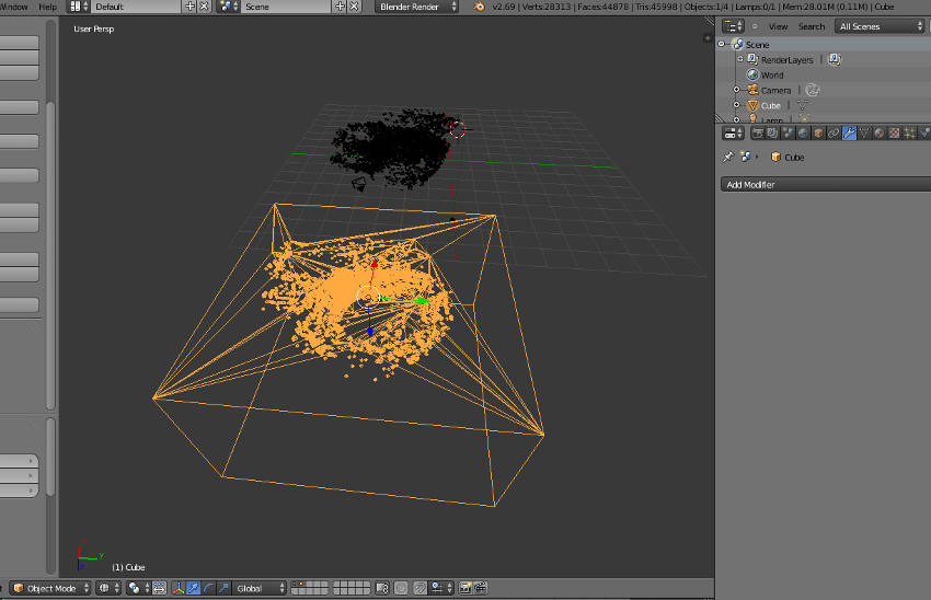 Once I had my objects solved I thought it would be too complicated to print on the 3D printer. So instead I want to make this objects negative space and cut it out of a cube. To do this I need to use the Boolean Difference Modifier.