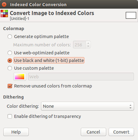 - all the images to make the gif are 1-bit. I do this in Gimp -> Image -> Mode -> Indexed .