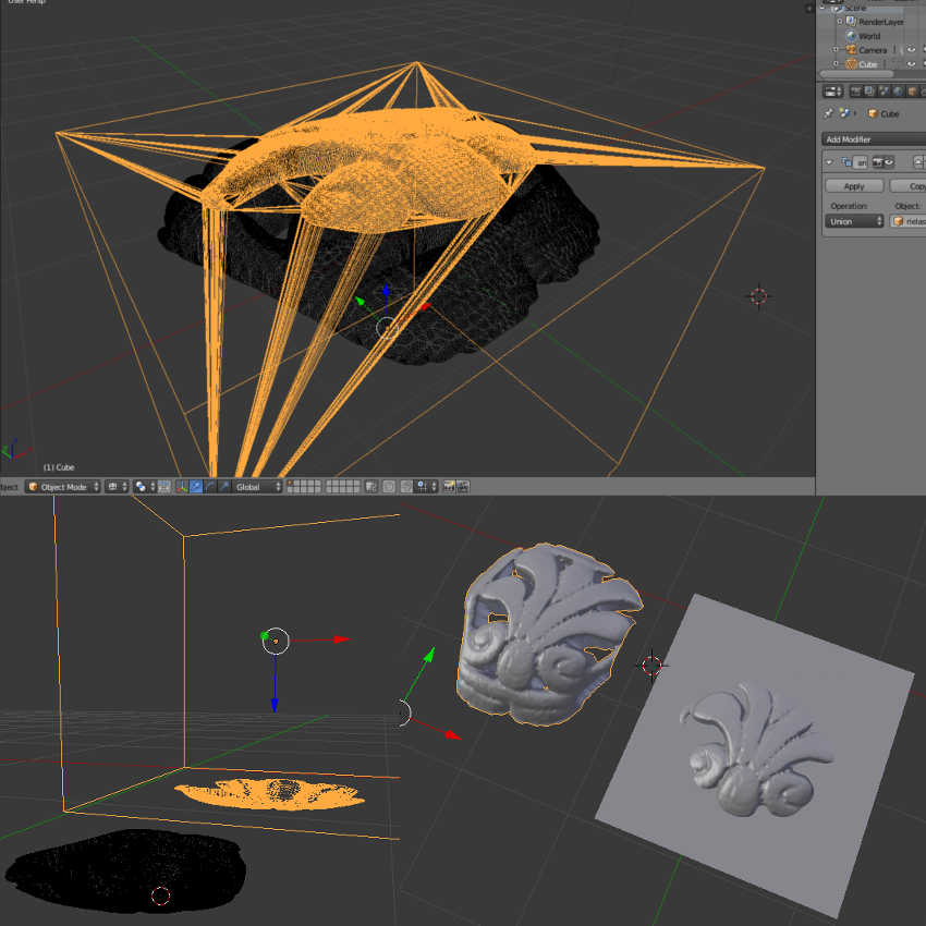 Unfortunately I did not have time to scan the whole object so instead I made a Boolean Union to add my scanned object in relief to a cube which could then be printed