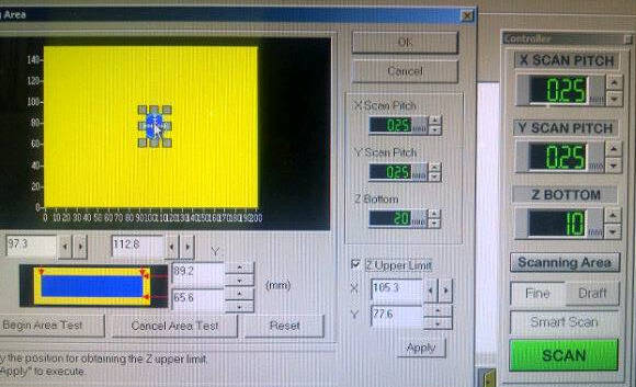 - Define the Scanning area (the blue box) by using the cursor or inputing the x and y values.