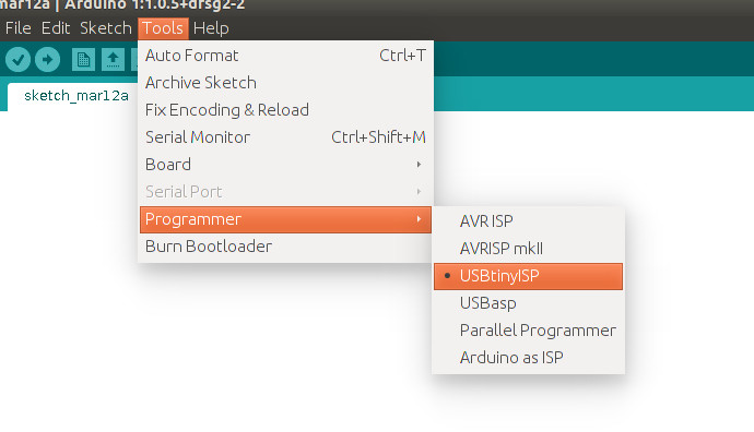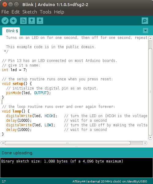After downloading Arduino - since I was using linux I did not need to download the FTDI driver. I did add the ATtiny board files (note make sure you get the correct zip file for your version of arduino)