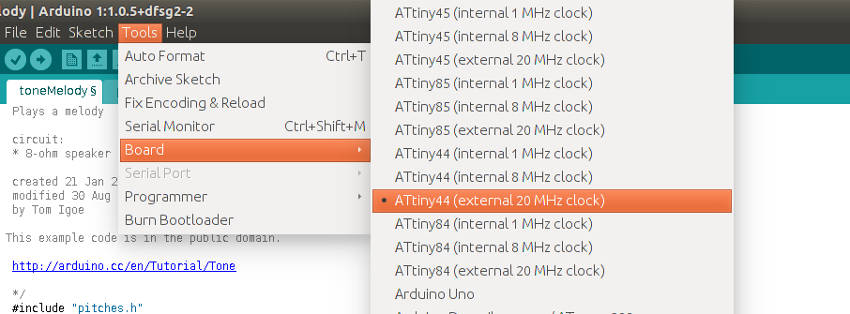 I then create a directory inside of Sketchbook called Hardwareand unzip the ATtiny44 files inside. Now, when I go to the Arduino IDE I have the ATtiny files inside the Board options.