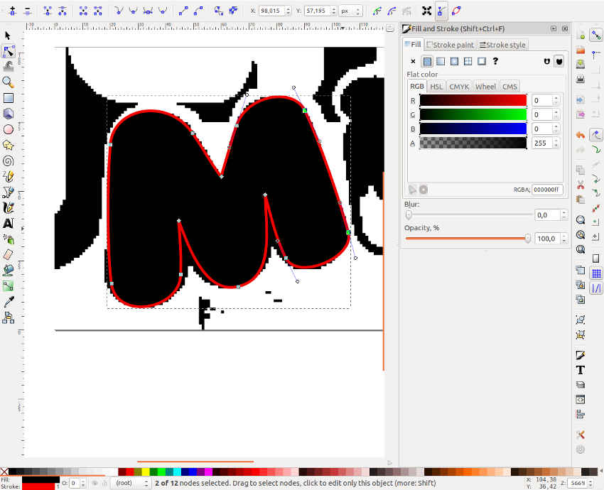 Next I imported into inkscape and set about vectorizing the letter M, using the Edit path by Nodes. The correct combination of vector points and click drags - and using click-drag -shift to create sharp corners, I traced the outline: