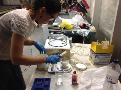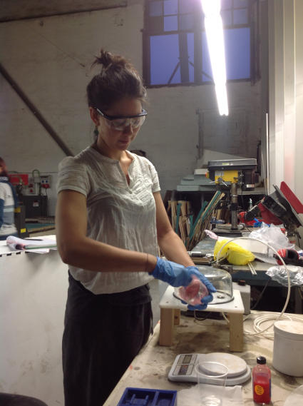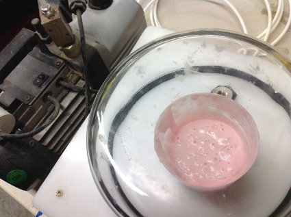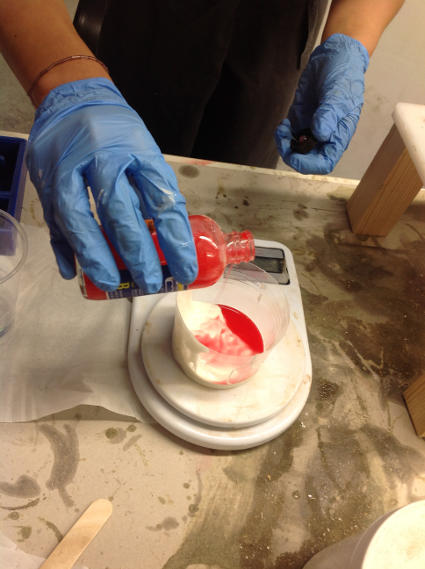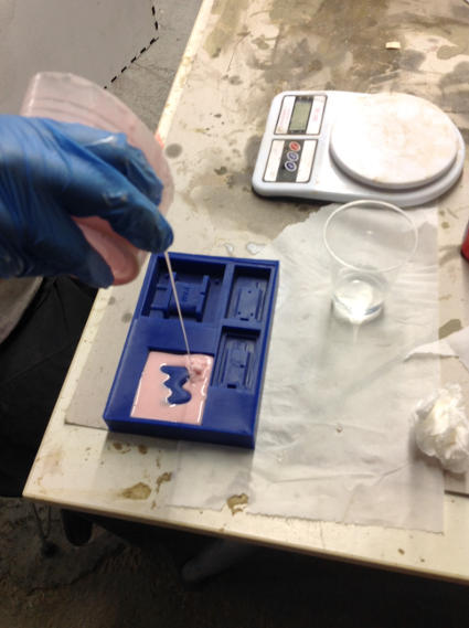 I am making a food mold, so I am using Smooth- Sil 940 Platinum Silicone Rubber Compound for food related applications. I mix 10 parts of A with 1 part B. After measuring out the mixture I give it a good stirring, ensuring even mixing. Then place the mixture into the vaccuum to remove bubbles, before pouring it into the wax mold.