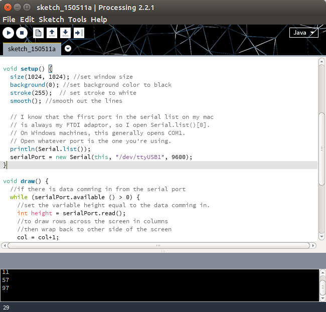 I had trouble directing it to the correct serial port. I knew I was using dev/tty/USB1 - by using dmesg on linux. However even using the correct index from the list of printed ports available did not work and the serial Processing library wasnt very helpful. I asked Ferdi my instructor and we made it work like this: "dev/ttyUSB1"