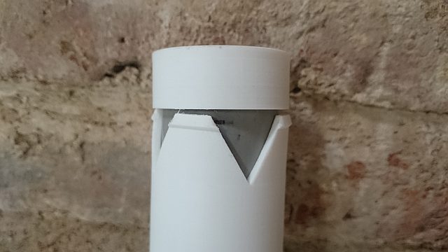 the first print didn't work out very well. first of all the offset of the inner diameter was only half a mm, that made the pipe just fit in but with force. that force broke the valve, it seems ABS is not the right material and also the shape of the perforation leaves it with weak points.