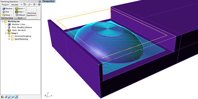 finishing is taking away the rest of the material to create the actual shape. there are various strategies, in this case it's a spiral finishing because my shape is round.the cyan lines in the picture are the path the tip of the milling bit is taking.