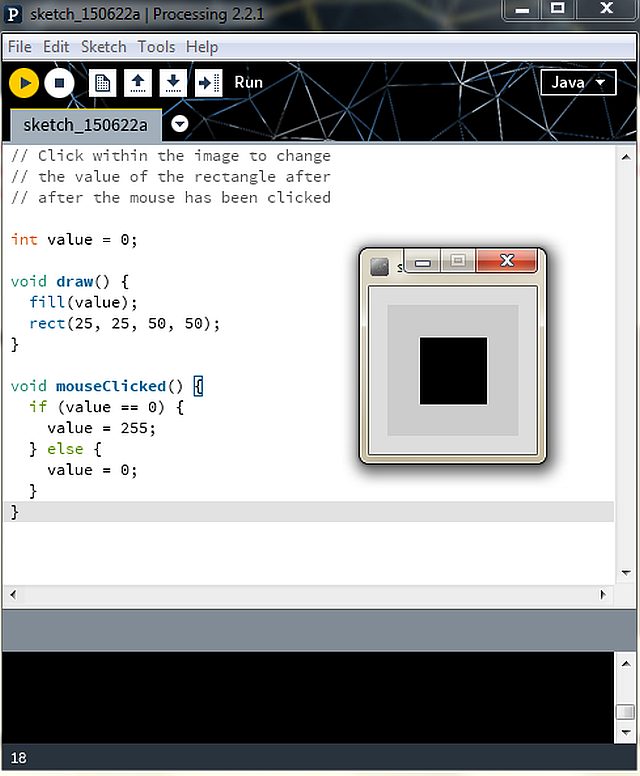 the closest example i could find was the "mouseClicked()". when you run the code a rectangle appears and when you click on it it changes the color.