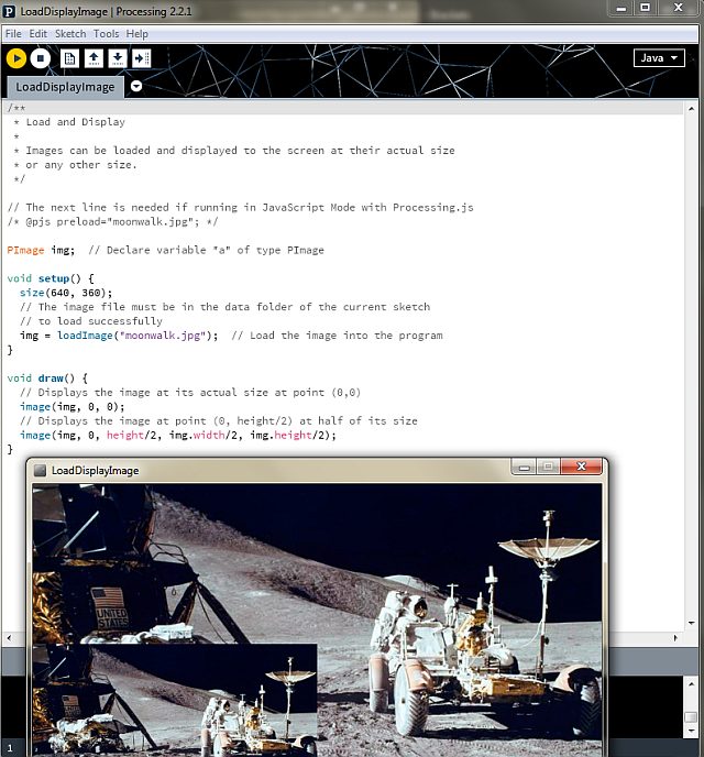 then i looked at various examples in to try to understand the code for loading an image. also the tutorial was very helpful to make me understand the code. whatever image you want to load needs to be in the same folder as the sketch, preferably in a folder called "data"
