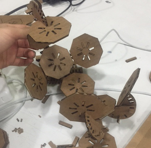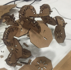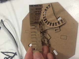 Niel told us you should use cardboards for making the kit because it's so cheap and easy to bend. After the video lecture and some local lectures, I tried to make like a hinge that allows to change the rotation. The joints look like pies and they have some holes for pinning its degree. So you can set the degree as you want and make something more freely.