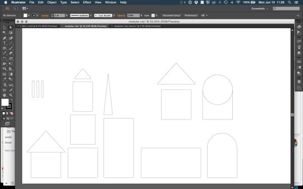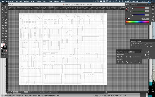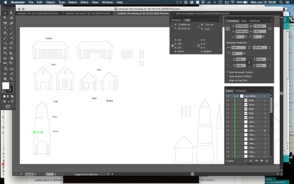 In Illustrator I started sketching the basic shapes to build most of the structures with. This assignment taught me a lot about Illustrator and 2D design in general. For instance, I discovered the additive and subtractive functions in pathfinder that were amazing for this project. As I learned by now, I tried to keep all parts and instances of the designs handy (save to a second file before combining, etcetera) to do quick troubleshooting later if needed.