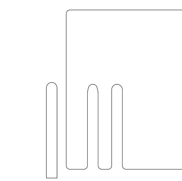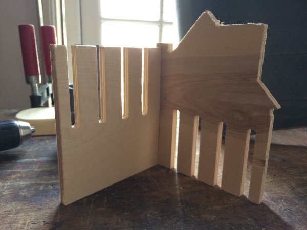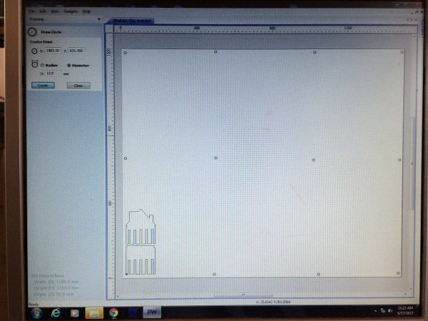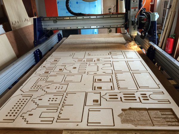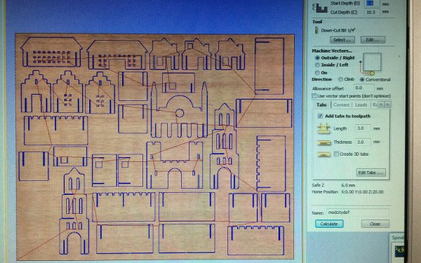 Adjusting the slots in Illustrator and adding them to the houses and walls took way more time than I thought, a parametric solution would have been great here. Also, as I'd noticed with the test, the .dxf files exported from Illustrator do not import in Partworks. I had to load them in Rhino for Mac, fillet all the corners again, and then export as .dxf again. With two hours left in the day I finished, loaded and placed the parts in Partworks (closed a whole bunch of vectors!), put the tabs in and ran the whole job.