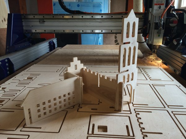 After drawing the drill-holes on the wood in Partworks (so that I'd continue to see them in my document when placing the city-parts), I ran the drill job and secured the wood to the sacrificial layer. Changed end mill, calibrated the axes and first ran the test job. I found that slot nr 5 was perfect in width, and that I'd best make them 7.55mm long. (Indeed I took the first picture when the parts weren't positioned correctly yet, if you spotted that :)