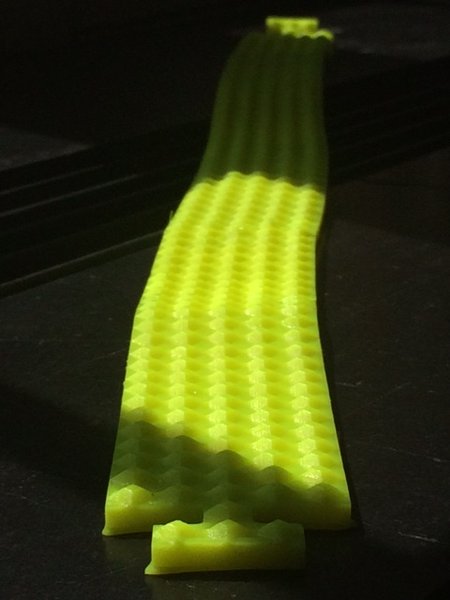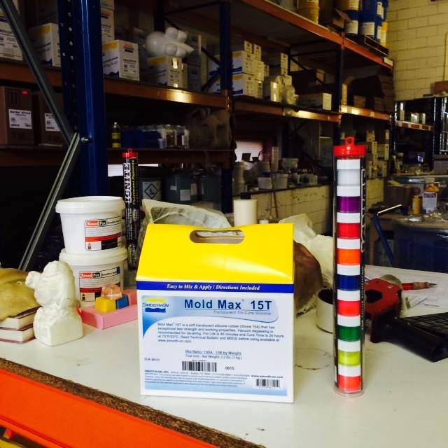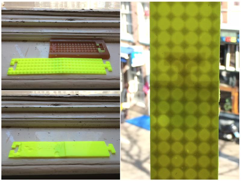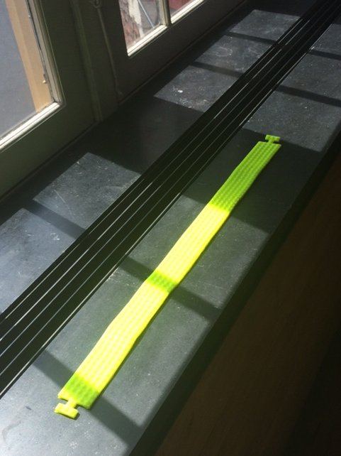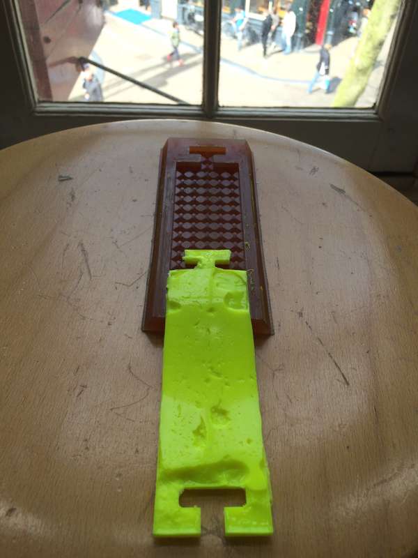 Not only the very detailed 3D modeling, but especially wrapping your head around modeling the second level negative shape of the object you have in mind. It drove all of us crazy. More about that later though. First I went to the FormX store to get informed about kinds of silicone, dyes for silicone and the compatibility with the rubber we have for the molds. I bought a fairly strong silicone mix, because the band will have to hold the weight of both the mirror and the bended plywood. I picked out a neon-yellow dye to try and match the original Hay band.