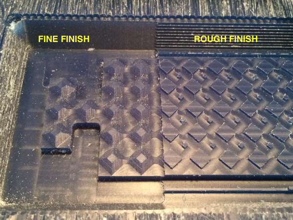 For the fine job, I changed the overlap to 0.95. Fab Modules software estimated the job time to be 4 hours. I took this picture after one hour of milling, and it clearly shows the difference between the two kinds of jobs;