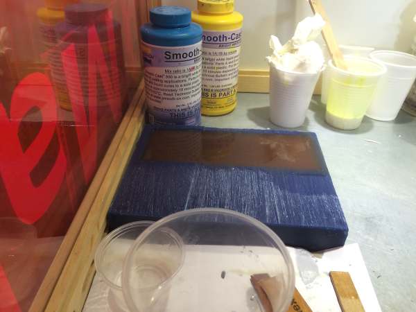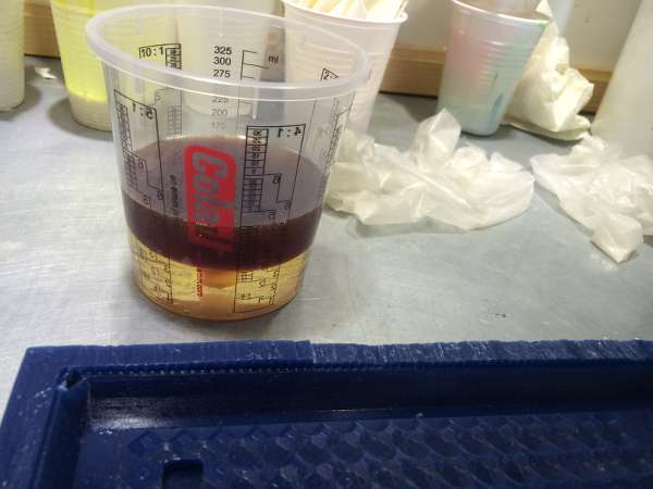 I then mixed the two components that form the liquid rubber (urethane mold compound 1:1 rubber mold compound) and calculated that my mold will hold about 150ml (on the safe side). After casting there was 30ml left, so for the second mold I can mix components more economically. And now.... wait 16 hours for the rubber to cure.