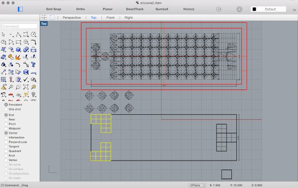 April 7 / It took me a couple of days to finally finish modeling the 'mold of the mold' today. I got stuck in Rhino many times, but now I can say that I have the workflow pretty much under control, and I can find the answer to almost any problem that arises. Half of today got into figuring out why I couldn't cap a polysurface, so that I could substract it from anothe polysurface, and so form the 'outer box' of my model. The final step, took me hours. In the end, Loes was the one that suggested that I might not need a box. Since the STL is converted to a heatmap by Fab modules, the tilted surface alone may be enough. Thank you Loes! Let's hope so.