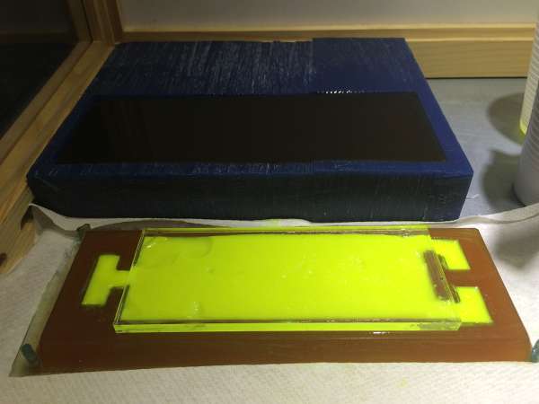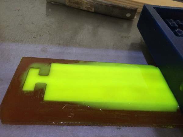I then prepared the silicone rubber with the neon yellow colorant that I bought. When I was mixing the parts for the silicone cast, I noticed how its texture was a lot different than the rubber for the mold - it was hard to stir even, it only got a little better when I fully mixed the components. Casting the resin in the mold was more difficult too because of its thickness, so much that the top of the silicone was lumpy after I poured - hence the acrylic plate you see on top of it. Now, a 24 hour wait. Heck, I'll give it a weekend!