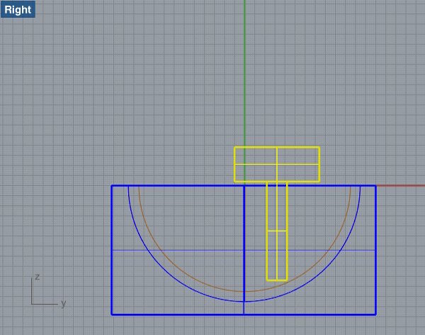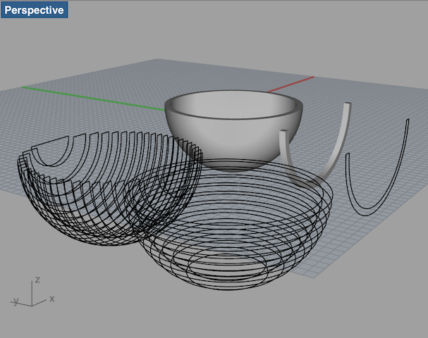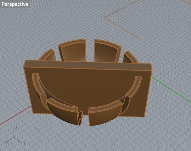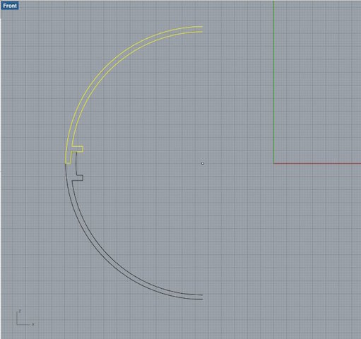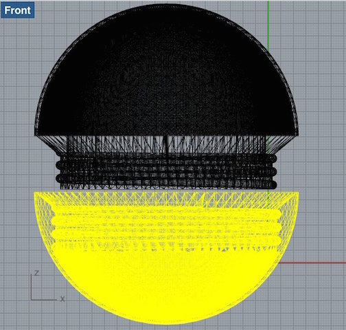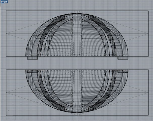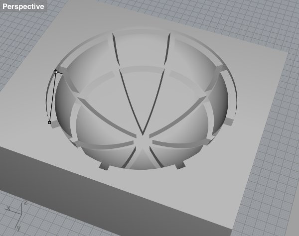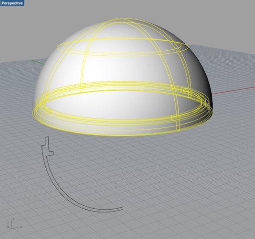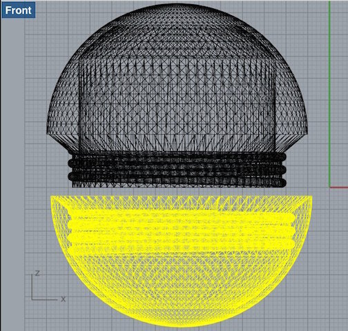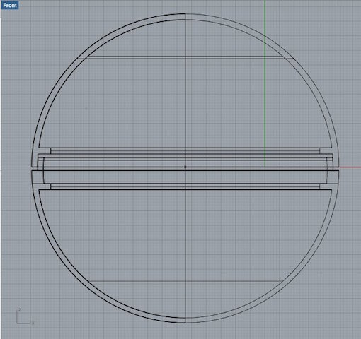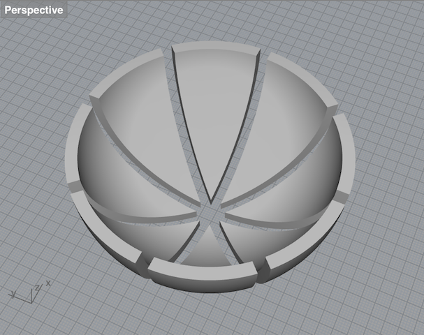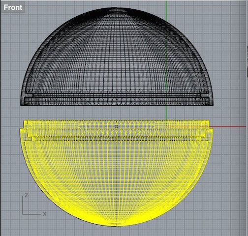 Eventually, in the last week of the project when I knew my silicone covers worked out, I started from scratch and designed a new ball without screw threads, just a thin edge that would make sure the top and bottom kept their position (right screenshot). I used a new technique though - drawing a quarter of the ball in 2d, and then using the 'revolve' command in Rhino to create a 3D shape.