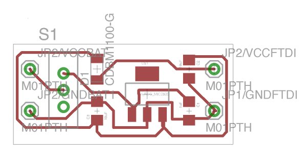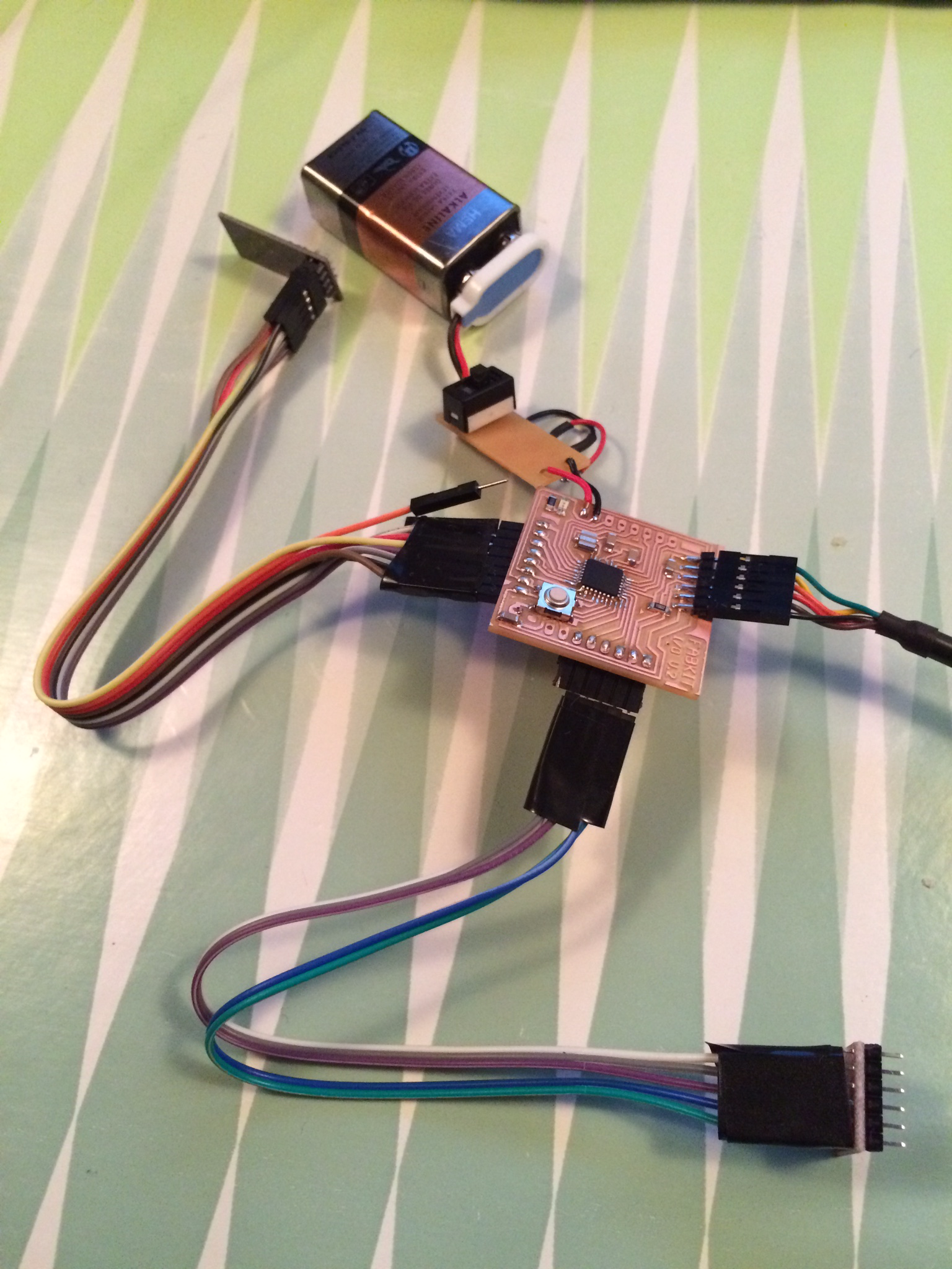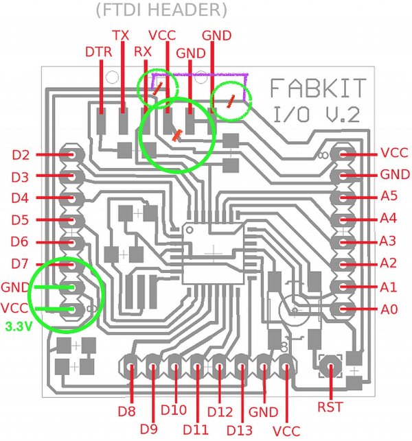 Zaerc taught me a simple trick how to fix (read: molest) the Fabduino so it doesn’t take 5v from the FTDI cable and is powered through battery/regulator with 3.3v alone. Earlier, I already changed the regulators on the breakout boards from 5V to 3.3V. The radio as well as the accelerometer might otherwise get damaged. We scratched and rerouted the traces leading from VCC in the FTDI header to the board.