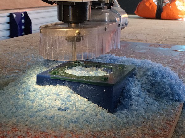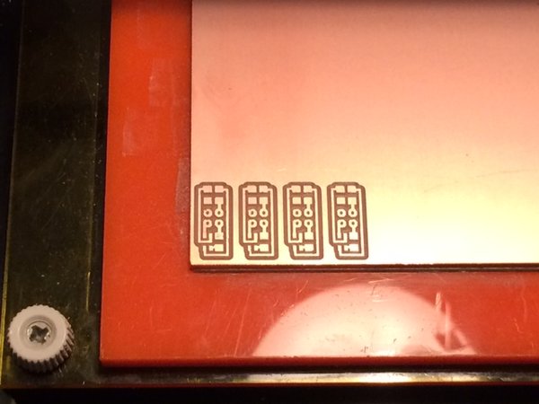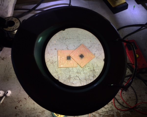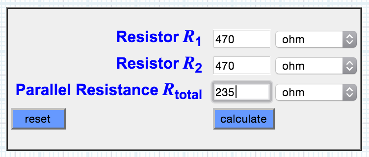 However. I designed and milled the RGB breakout boards before finding out that there is no 200 Ohm resistor in the lab inventory (about 200 ohms) wasn't available in only one component. Also, since the board was so tiny, I could't place two smaller resistors in series to solve the issue. The elegant solution now was to stack two resistors on the one pad (also cutely called 'piggyback'), and to determine their value in a parallel set up. I did that using this parallel resistance calculator. Unfortunately we were all out of a 330 Ohms resistors so I stacked two 470 Ohm ones that will deliver value of 235 Ohms. Hopefully this will not affect the brightness too much.