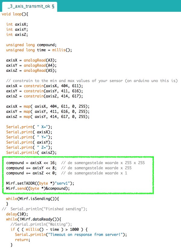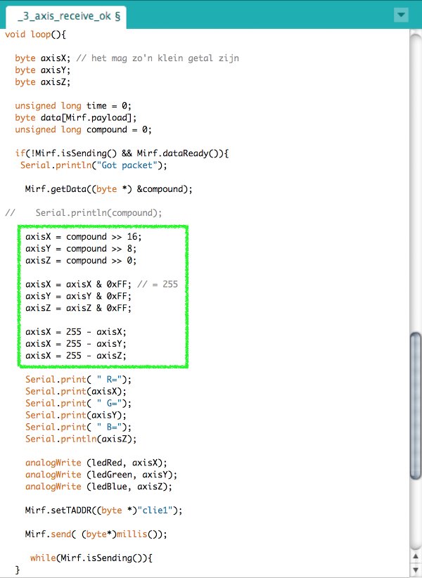 Coding together with Zaerc, I learned a couple of excellent tricks, such as how useful it is to have the serial monitor of the transmitting ball already print the mapped RGB values of the leds, instead of just the accelerometer data. But most of all, how to use math in order to be able to send three values within one byte. Basically by shifting the comma and thus multiplying each value by a multiple of 255 before adding them into one compound value that is sent over to the other radio module. The receiver sketch shifts the comma again and divides the compound to get the seperate values. I highlighted the code in the exerpts below here: