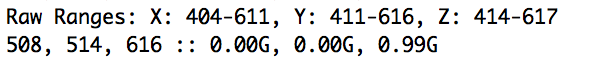 June 9 / A long night later, with lots of help from Zaerc, I got working: sending accelerometer data over radio, mapping it to rgb values that control the leds on the second microcontroller board. Amazing. To get the right values out, I found an excellent adafruit sketch with which to calibrate the accelerometer, since the range of numbers that could be sent was too wide and the effect in changing rgb colors too little. I arrived at this range;
