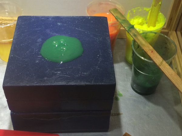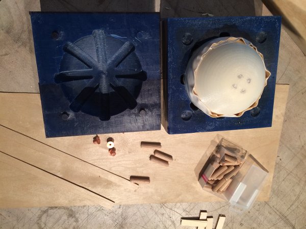 To determine the place of the new keys I placed one of my balls inside the mold and wrapped it in tape so that it would fit tightly. I lasered a bunch of thin, flexible pieces of wood the size of the 'threads' of my mold, drilled new holes in the bottom mold and placed pointy pegs in them, that would leave a mark on the other side, and carefully placed the top mold on it. Then I drilled holes where I saw the marks and placed wooden pegs in them to function as the new keys. With that done, I hand drilled a large pouring hole in the top mold and made a first test-cast of the silicone that was left from my casting assignment. It turned out to be not enough, but since it was a test cast (I wanted more transparant material for the final casts) I didn't mind that much. Now wait 24 hrs.