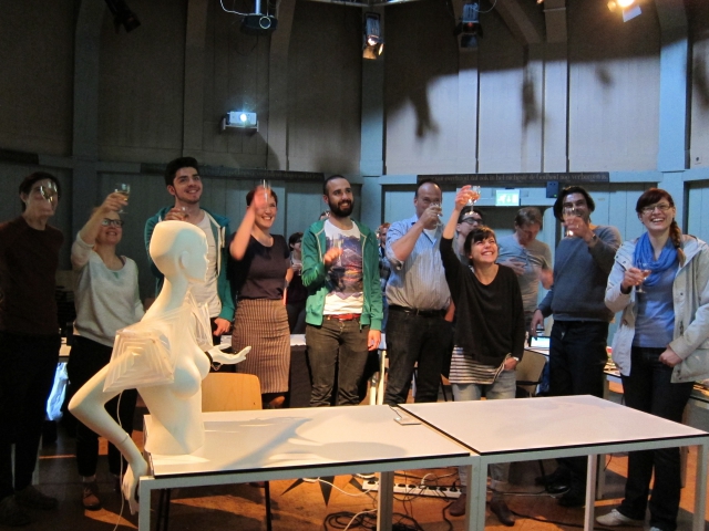 Cheers, we did it! But not just like that. The pictures pretty much sum up presentation day for me: Working to fix my project all through the previous presentations, and then making it work just in time! I suppose that's what Neil's law on time and effort is all about :)