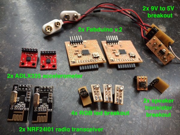 For each ball to be able to control the other, each ball needs at least 2 RGB leds, a speaker, an accelerometer, a radio module, a switch, voltage control and a 9V battery. I will make breakout boards to use with a Fabduino, since I need about 14 pins in total per ball. The accelerometer and the radio module come as breakout boards of their own. I decided to prepare the electronics for the most ideal situation described above here, but I do realize that programming this may take so much time that plan B is to reconsile with having one ball controlling the other over a radio connection.