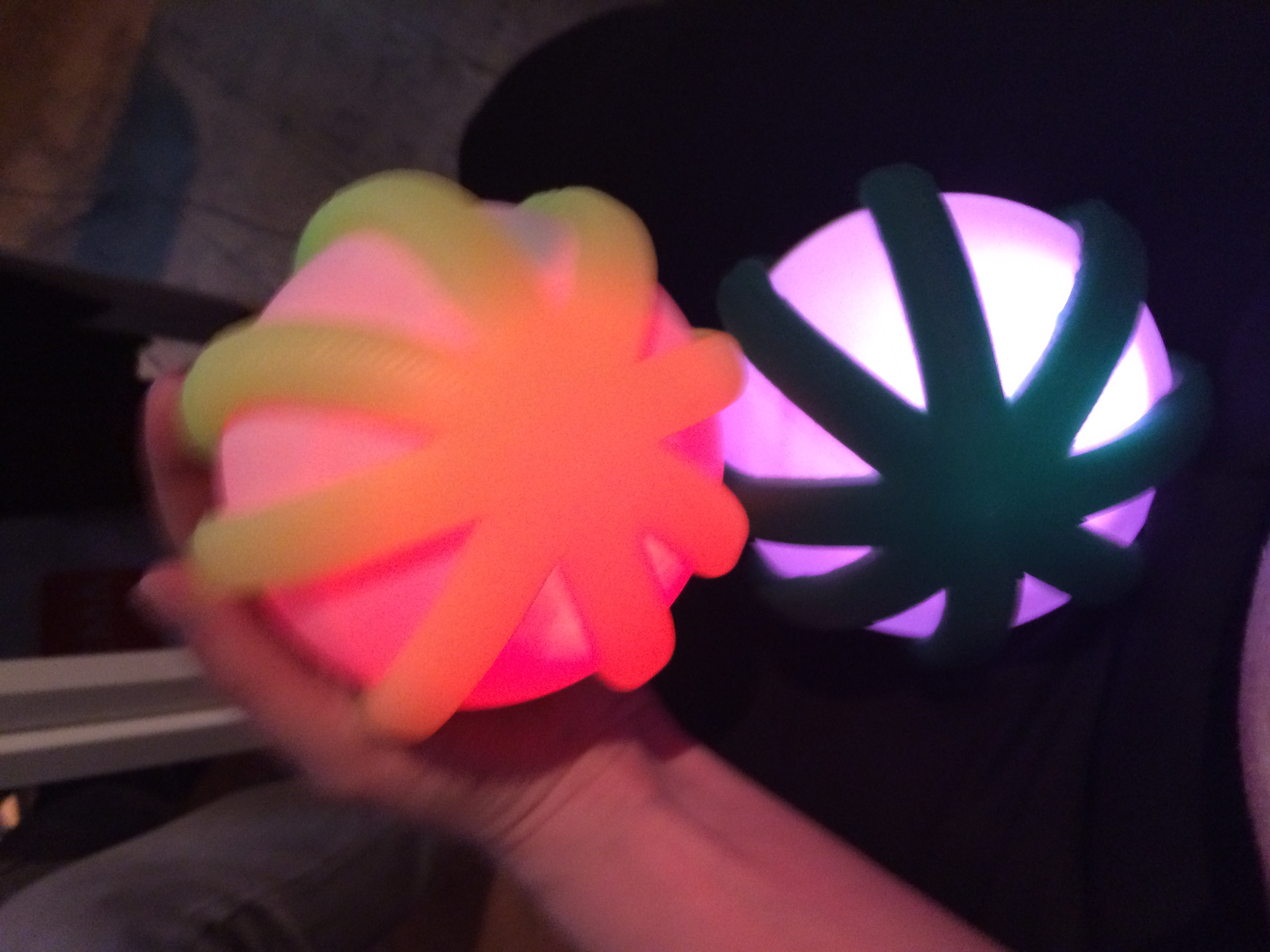 After several hours and help from Zaerc and Emma I realized that I had to make my mind up about the presentation, whether to postpone it or to go ahead. I decided to go ahead and show the video to Neil, as proof that I actually did it and however briefly, it worked. I also wanted to try to make the balls at least do something; such as control their own leds with their own accelerometers, like I did before. Less interesting, but well still something! I was programming and testing that until just before my turn which was rather unnerving; turned the switch, closed the balls, stretched the cover over it and luckily it still worked!