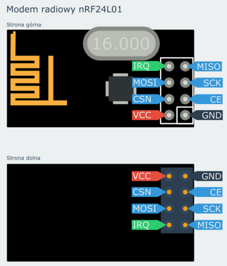 | NRF24l01 radio transceiver | 3,3V GND SCN SCK MOSI MISO (CE) (IRQ) |