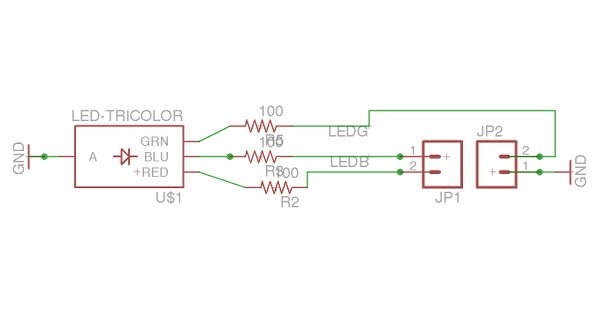 | RGB led breakout | RGB LED R: 2x 470 Ohm resistor G: 100 Ohm resistor B: 100 Ohm resistor |