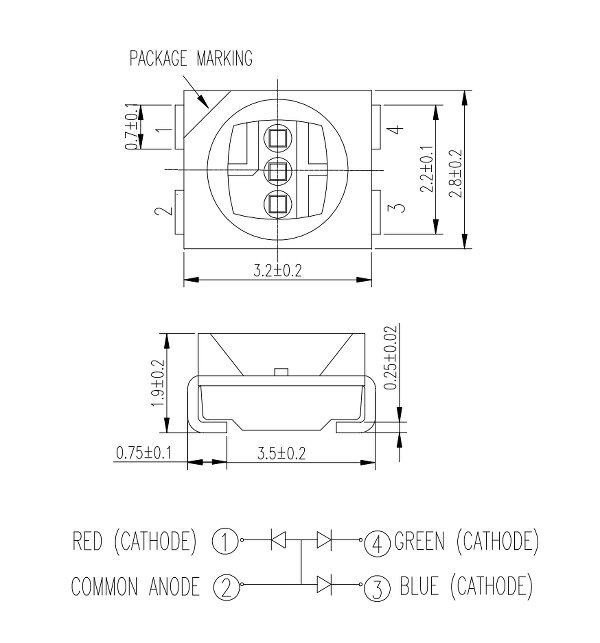 These are the minimum values, so I decided to use a slightly higher resistance: 100 Ohm, for the green and blue LEDs and 200 for the red. Since I need the lights to be very bright I think this is enough insurance.
