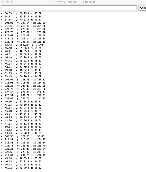 Earlier, I tried to do this on the Fabduino but the accelerometer data I got was fluctuating all the way, making it impossible to map and translate to rgb values.