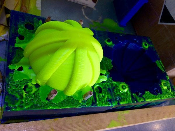..................................................................................................................................................................................June 9 / After the partly successful test cast, I got new silicone and dye and made the first final cast which I unmolded without taking any pictures whatsoever. That says a lot about my state of mind in those final days, but it was great. A big bouncy jellyfish that (after cutting away the excess silicone, fit my balls nicely for protection. They are flexible enough to be removed and strong - the weakest points ofcourse are bubbles, which luckily I hardly had any of. At the day of the presentation I unmolded the second final cover. A bit too dark green, but still translucent with hte LEDs behind it. This assignment has gone wrong in so many ways but it also got back to its feet everytime, often better even :)