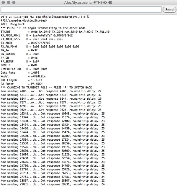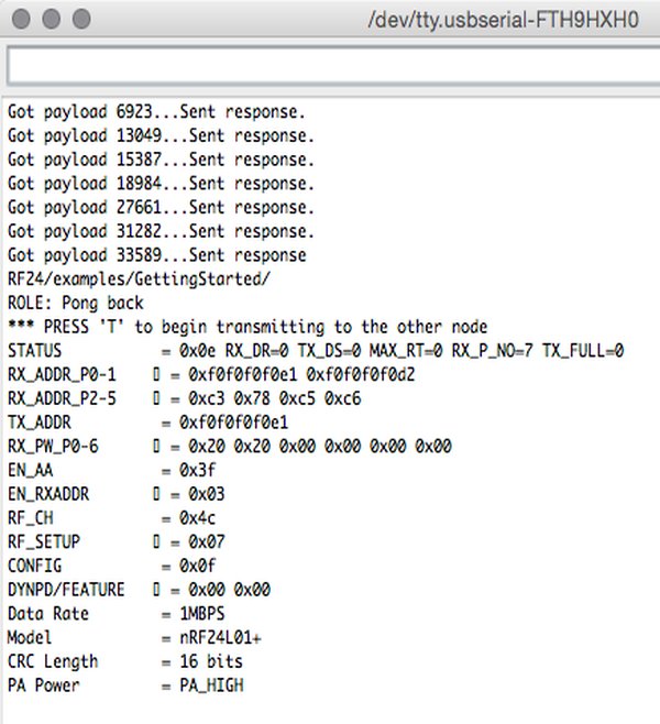 I first tested using this example code that was using the Arduino RF24 library, and communication was there (a ping and a response time). I made/assembled a transmitter and receiver sketch that is sending and printing the accelerometer data, but it gave me problems compiling and I didn't manage to fix it. Emma then suggested I tried the Mirf library instead. Using Mirf we also managed to get a successful payload sent, see screenshot on the right. Using this sketch I eventually managed to successfully send a message as well as a number.