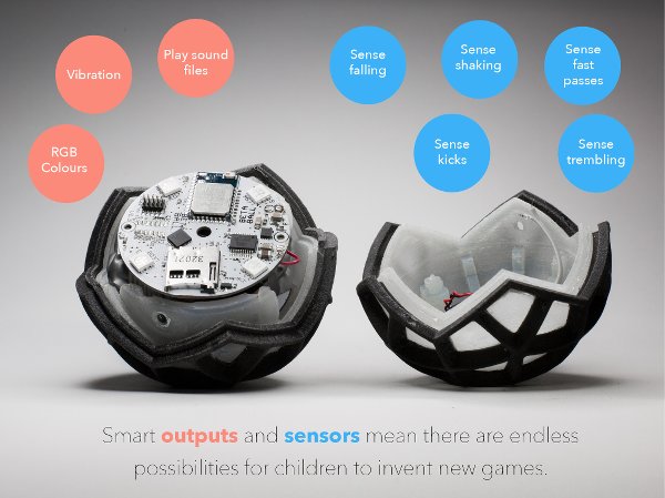 Hackaball is a successful 2015 Kickstarter project described as “a programmable ball for active and creative play”. The Hackaball target audience is six- to 10-year-old children who have started learning programming skills in primary school. The ball is fitted with many sensors to detect whether it’s still or moving, as well as whether it’s being dropped, bounced, kicked or shaken. Children can come up with games by modifying the ball’s behaviour through an iOS or OSX app.